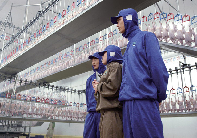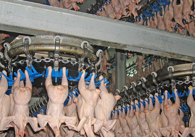 一只只活鸡通过兽医检验后,被工人倒挂在流水线上。为了避免强光照射,造成肉鸡拍打翅膀过度紧张,挂鸡车间灯光设置得比较昏暗,让鸡心平气和进入电击槽。将鸡电晕后放血,不仅符合动物福利,让鸡在昏迷状态下死亡,没有痛苦,还可以有效改善鸡肉品质、鸡肉嫩度和风味。