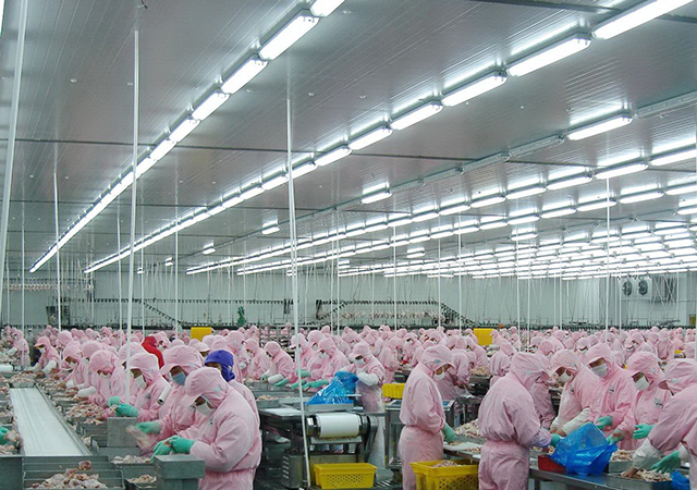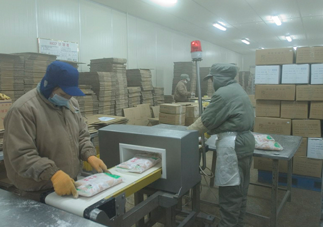 分割好的产品由品控人员抽检合格后,进行真空包装。包装好的产品必须通过金属探测器的检测,然后放入-40℃的速冻库速冻,以确保鸡肉新鲜度,速冻后再转入-18℃的冷藏库冷藏。